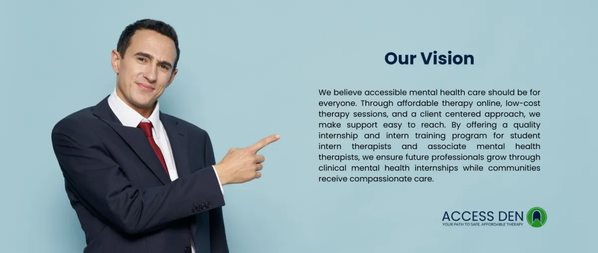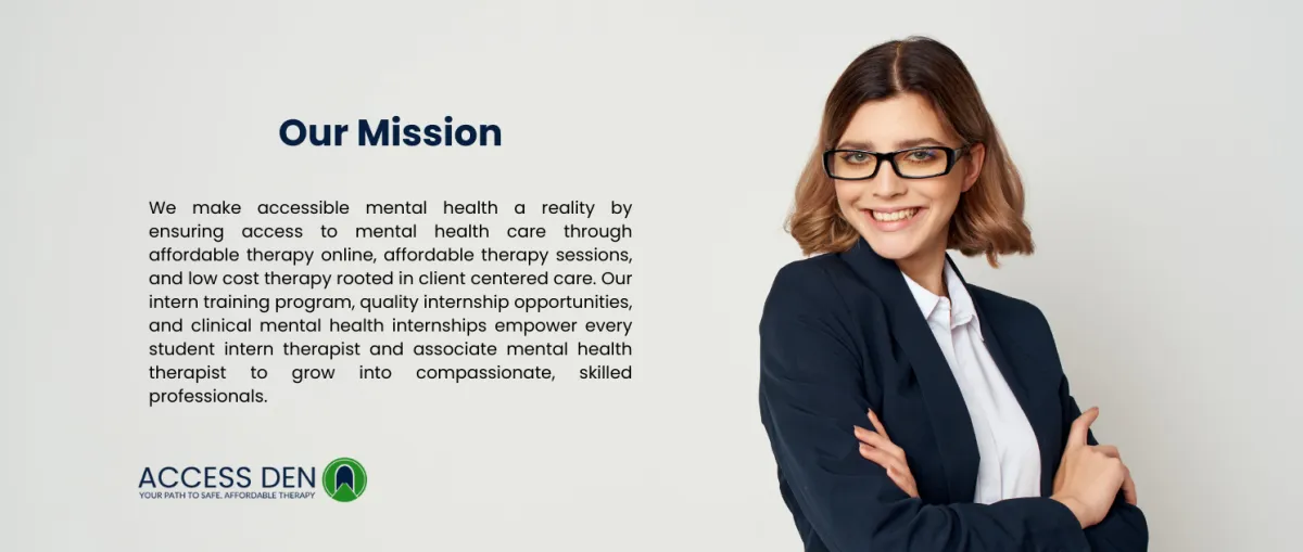 Access Den is committed to providing affordable, accessible mental health services while fostering the next generation of mental health professionals through comprehensive internship programs. Our virtual internships offer hands-on experience, expert supervision, and training in a supportive online environment. We strive to bridge the gap between quality care and career development by creating inclusive opportunities for students, interns, and clients alike. At Access Den, we believe everyone deserves compassionate support and meaningful growth.